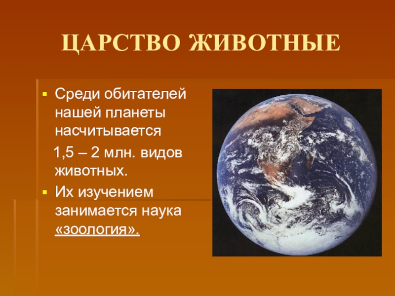 ЦАРСТВО ЖИВОТНЫЕСреди обитателей нашей планеты насчитывается  1,5 – 2 млн. видов животных.Их изучением занимается наука «зоология».