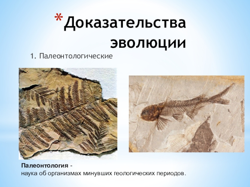 Доказательства эволюции1. ПалеонтологическиеПалеонтология - наука об организмах минувших геологических периодов.
