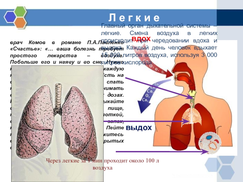 Главный орган дыхательной системы – легкие. Смена воздуха в легких происходит при чередовании вдоха и выдоха. Каждый день человек вдыхает 15 000 литров воздуха, используя 3 000 литров кислорода.