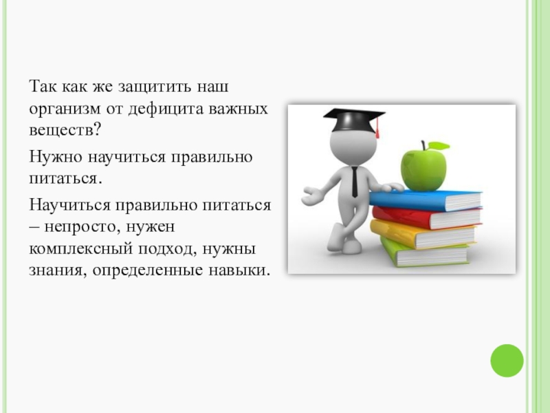 Так как же защитить наш организм от дефицита важных веществ?Нужно научиться правильно питаться.Научиться правильно питаться – непросто,