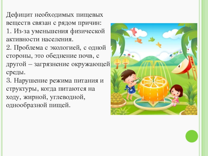 Дефицит необходимых пищевых веществ связан с рядом причин:1. Из-за уменьшения физической активности населения.2. Проблема с экологией, с