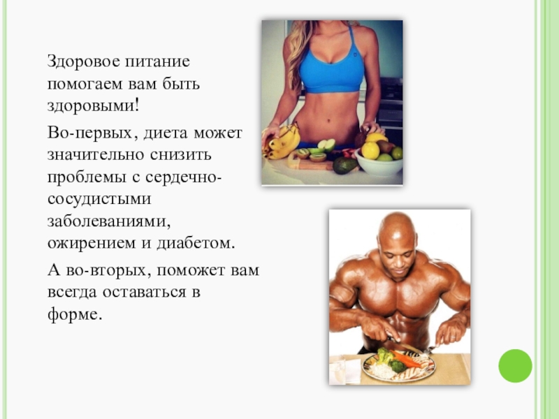 Здоровое питание помогаем вам быть здоровыми!Во-первых, диета может значительно снизить проблемы с сердечно-сосудистыми заболеваниями, ожирением и диабетом.А