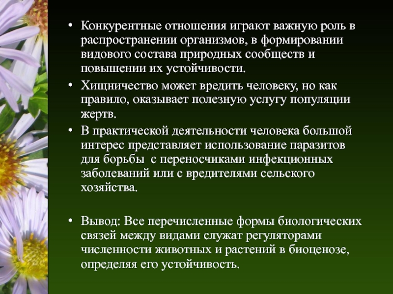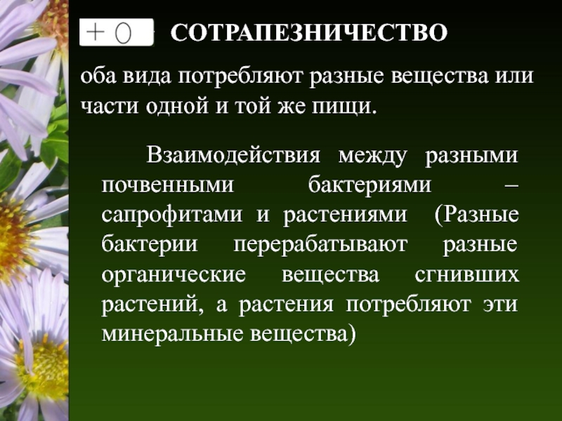 Взаимодействия между разными почвенными бактериями – сапрофитами и растениями (Разные бактерии перерабатывают разные органические вещества сгнивших растений, а растения потребляют эти минеральные вещества)