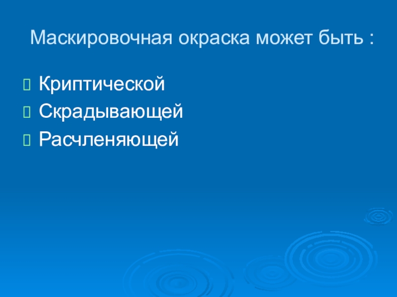 Маскировочная окраска может быть :КриптическойСкрадывающей Расчленяющей