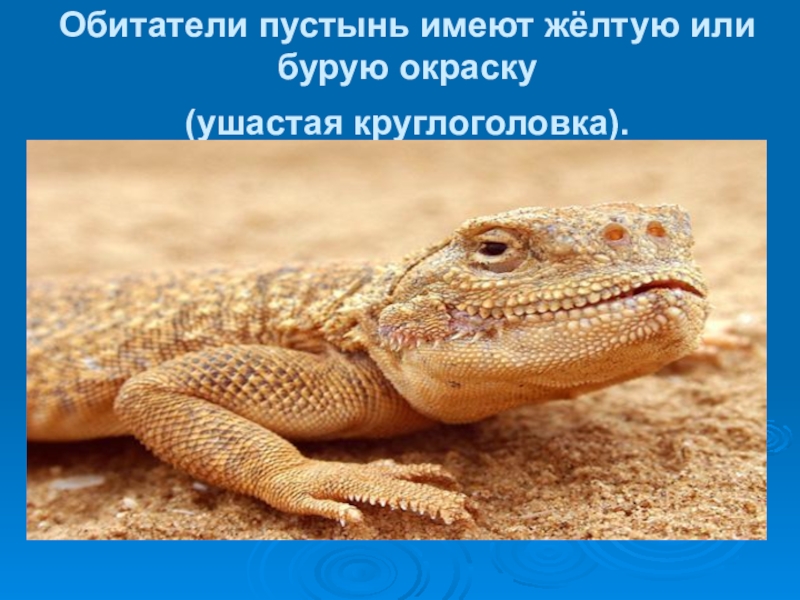 Слайд 22Обитатели пустынь имеют жёлтую или бурую окраску (ушастая круглоголовка).