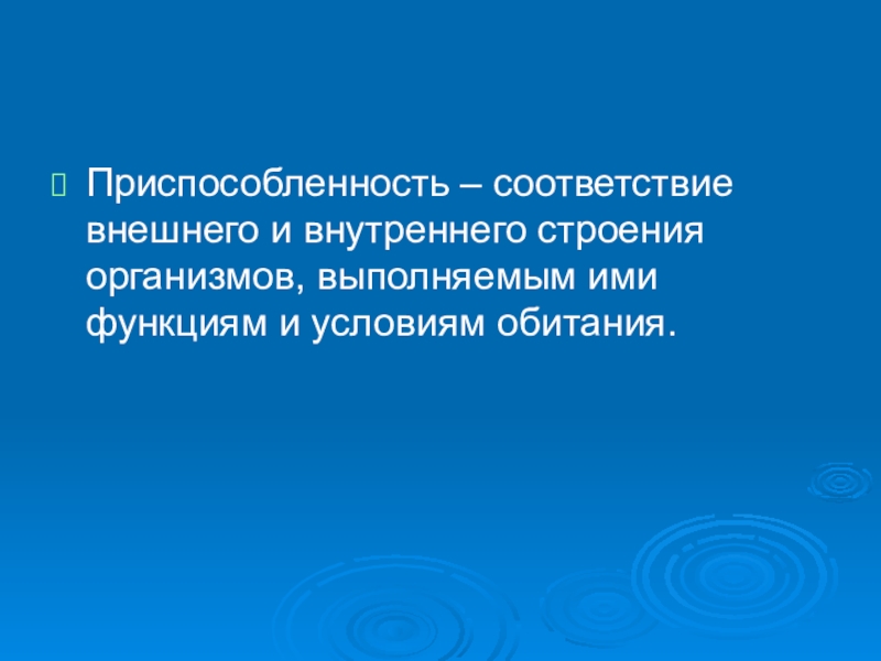 Приспособленность – соответствие внешнего и внутреннего строения организмов, выполняемым ими функциям и условиям обитания.