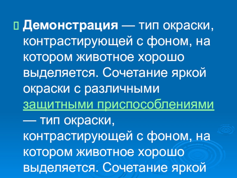 Демонстрация — тип окраски, контрастирующей с фоном, на котором животное хорошо выделяется. Сочетание яркой окраски с различными