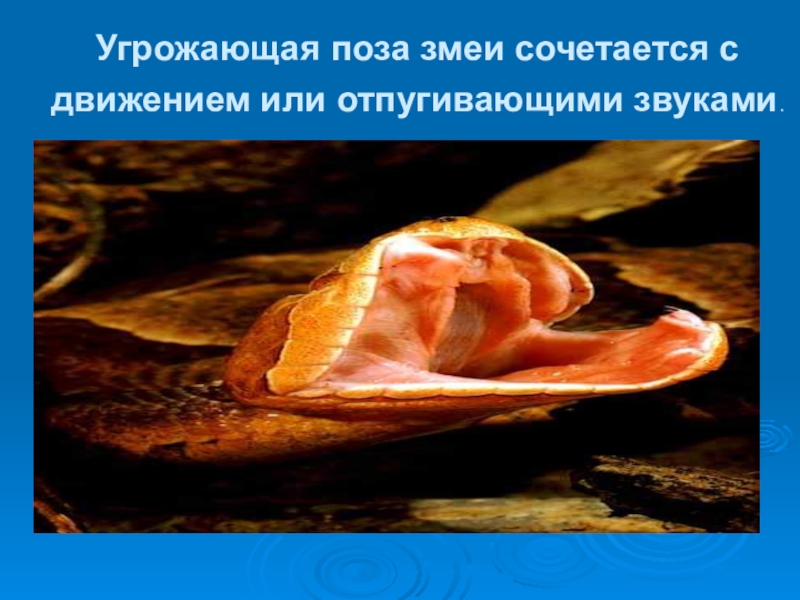 Слайд 45Угрожающая поза змеи сочетается с движением или отпугивающими звуками.
