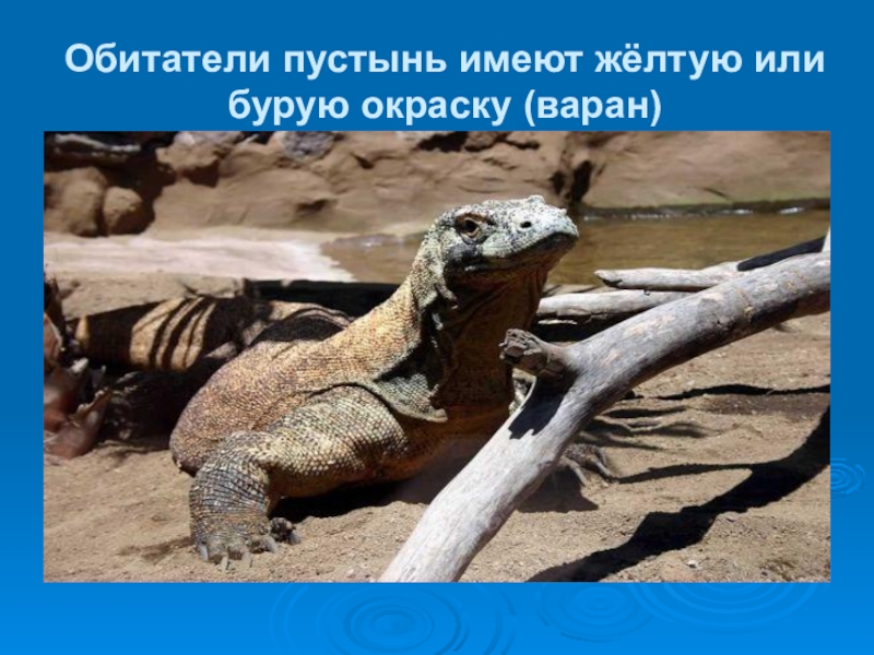 Слайд 23Обитатели пустынь имеют жёлтую или бурую окраску (варан)