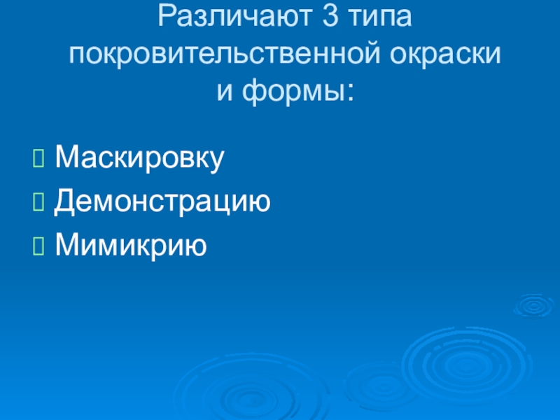 Различают 3 типа покровительственной окраски  и формы:МаскировкуДемонстрациюМимикрию