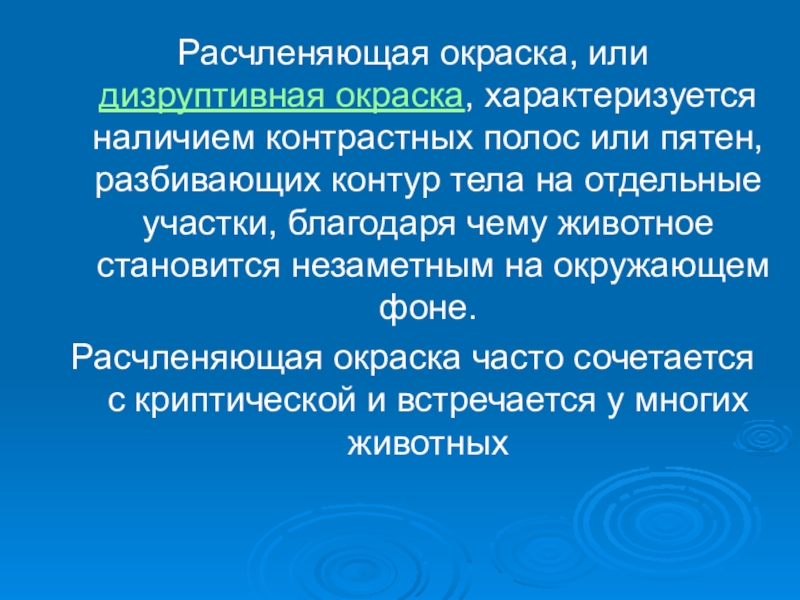Расчленяющая окраска, или дизруптивная окраска, характеризуется наличием контрастных полос или пятен, разбивающих контур тела на отдельные участки,