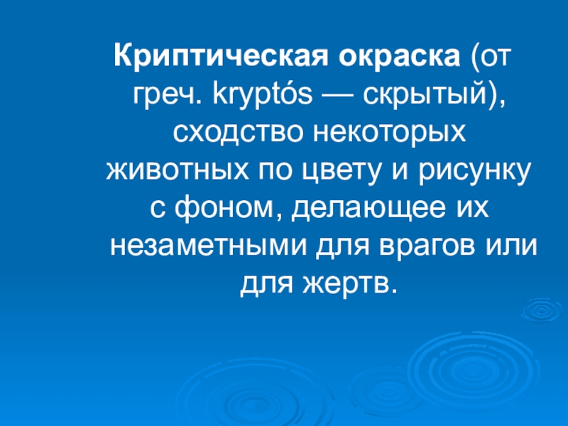 Криптическая окраска (от греч. kryptós — скрытый), сходство некоторых животных по цвету и рисунку с фоном, делающее