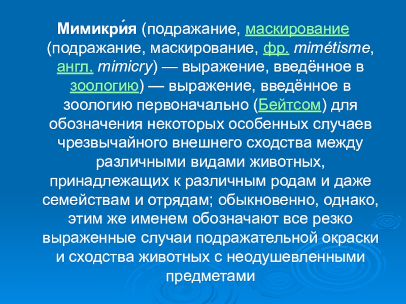 Мимикри́я (подражание, маскирование (подражание, маскирование, фр. mimétisme, англ. mimicry) — выражение, введённое в зоологию) — выражение, введённое в зоологию первоначально (Бейтсом)