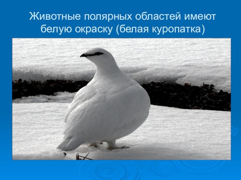 Слайд 19Животные полярных областей имеют белую окраску (белая куропатка)