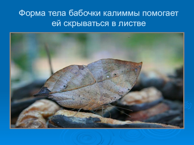 Слайд 10Форма тела бабочки калиммы помогает ей скрываться в листве