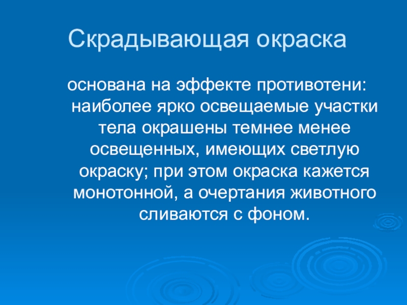 Скрадывающая окраскаоснована на эффекте противотени: наиболее ярко освещаемые участки тела окрашены темнее менее освещенных, имеющих светлую окраску;
