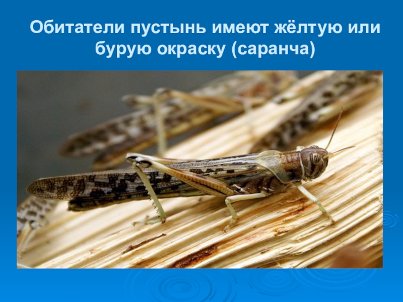 Слайд 24Обитатели пустынь имеют жёлтую или бурую окраску (саранча)