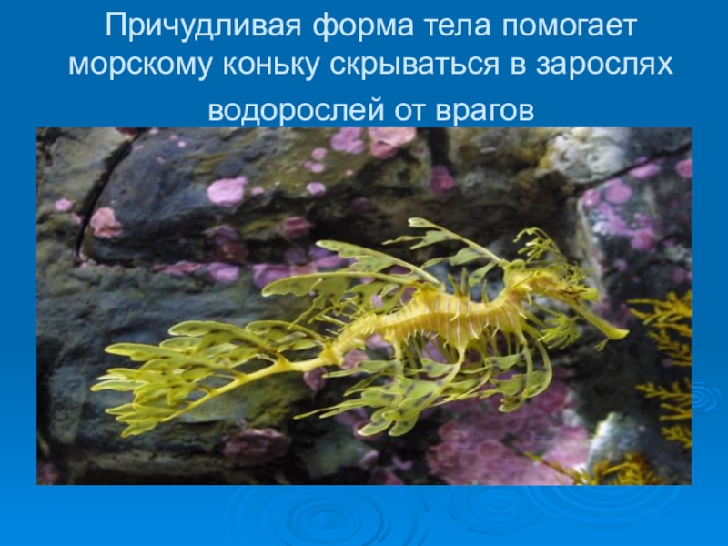 Слайд 9Причудливая форма тела помогает морскому коньку скрываться в зарослях водорослей от