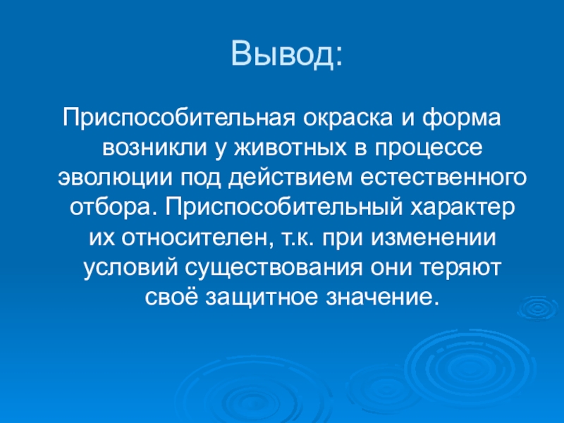 Вывод:Приспособительная окраска и форма возникли у животных в процессе эволюции под действием естественного отбора. Приспособительный характер их