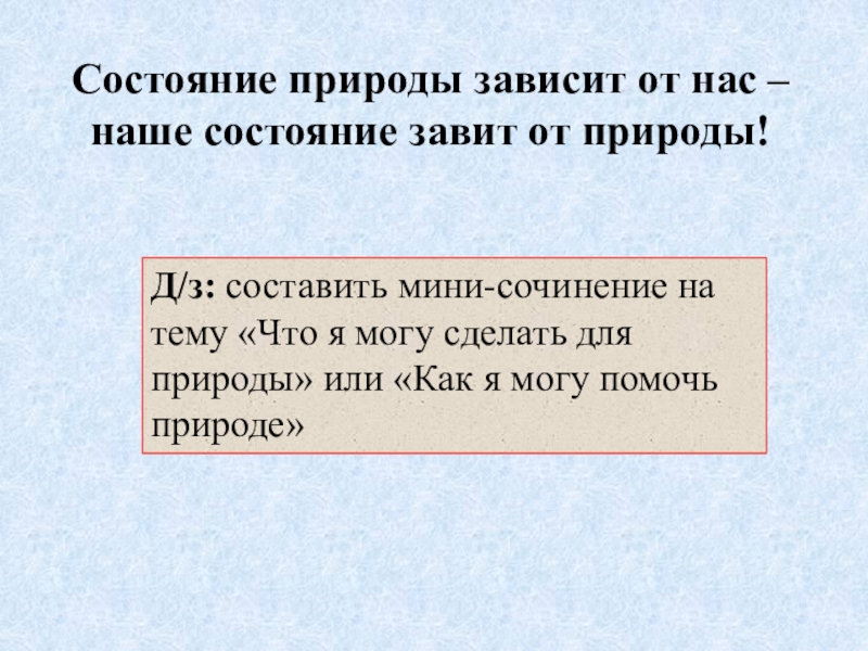 Состояние природы зависит от нас – наше состояние завит от природы!Д/з: составить мини-сочинение на тему «Что я