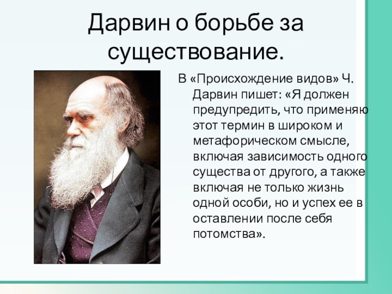 предупредить, что применяю этот термин в широком и метафорическом смысле, включая зависимость одного существа от другого, а также включая не только жизнь одной особи, но и успех ее в оставлении после себя потомства».
