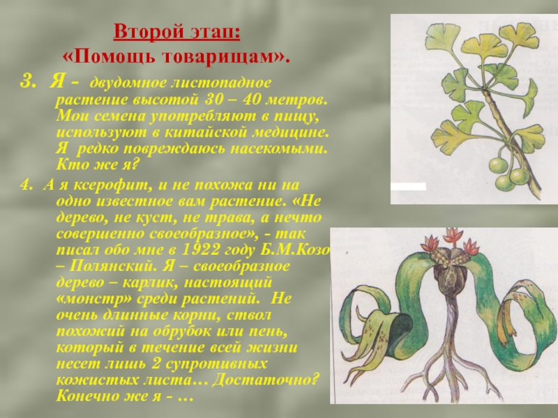 4. А я ксерофит, и не похожа ни на одно известное вам растение. «Не дерево, не куст, не трава, а нечто совершенно своеобразное», - так писал обо мне в 1922 году Б.М.Козо – Полянский. Я – своеобразное дерево – карлик, настоящий «монстр» среди растений. Не очень длинные корни, ствол похожий на обрубок или пень, который в течение всей жизни несет лишь 2 супротивных кожистых листа… Достаточно? Конечно же я - …