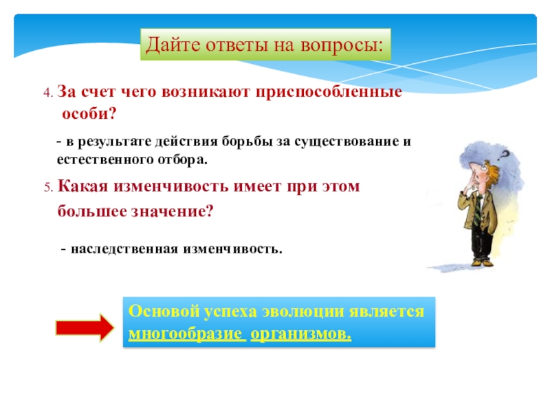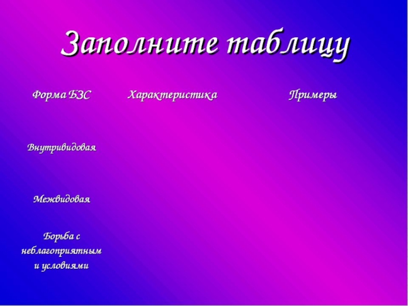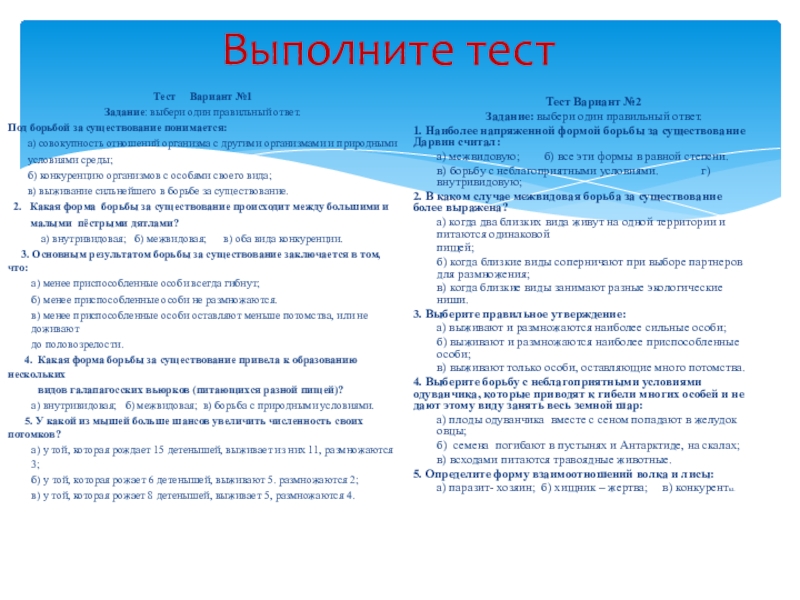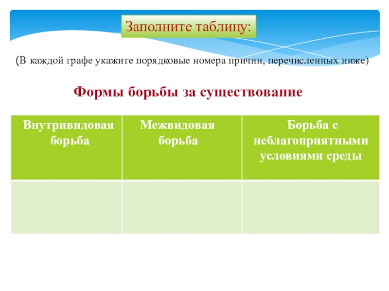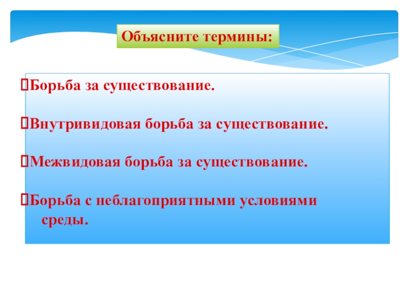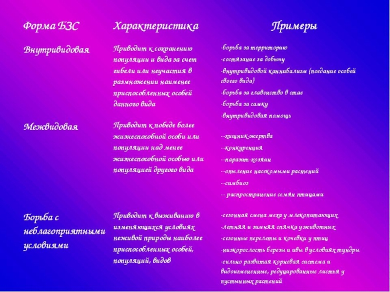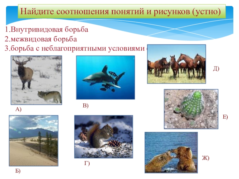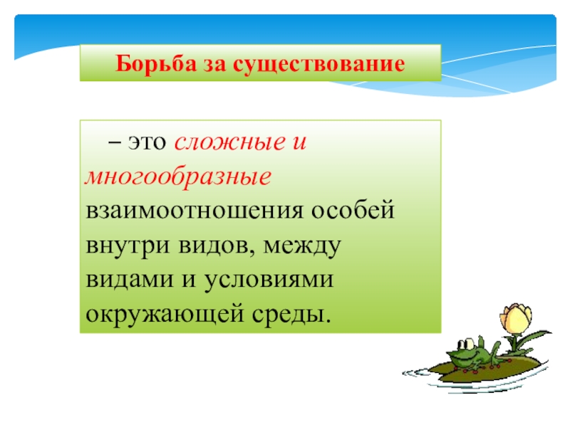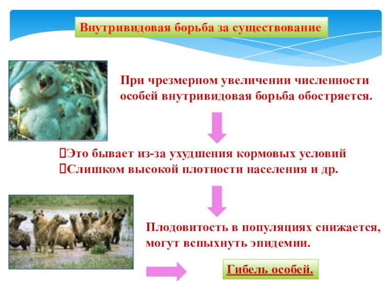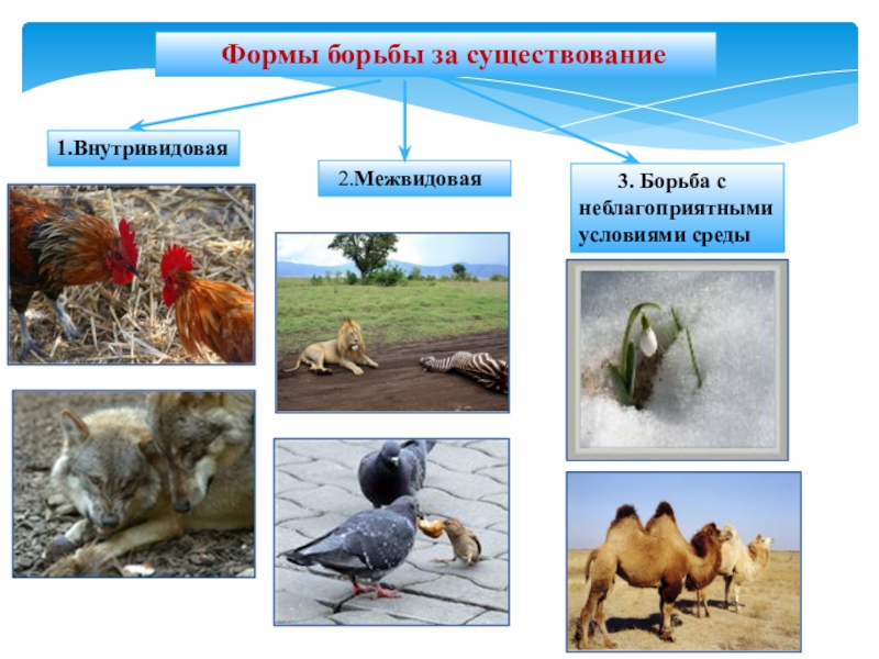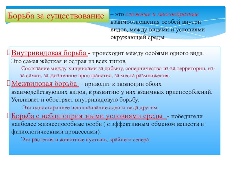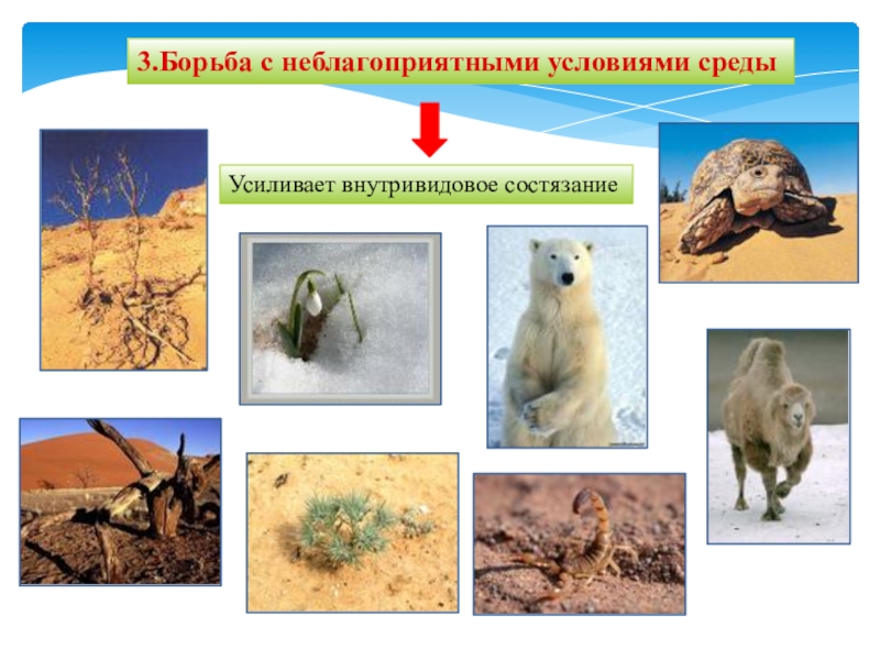 Борьба с неблагоприятными условиями среды - победители наиболее жизнеспособные особи ( с эффективным обменом веществ и физиологическими процессами).
