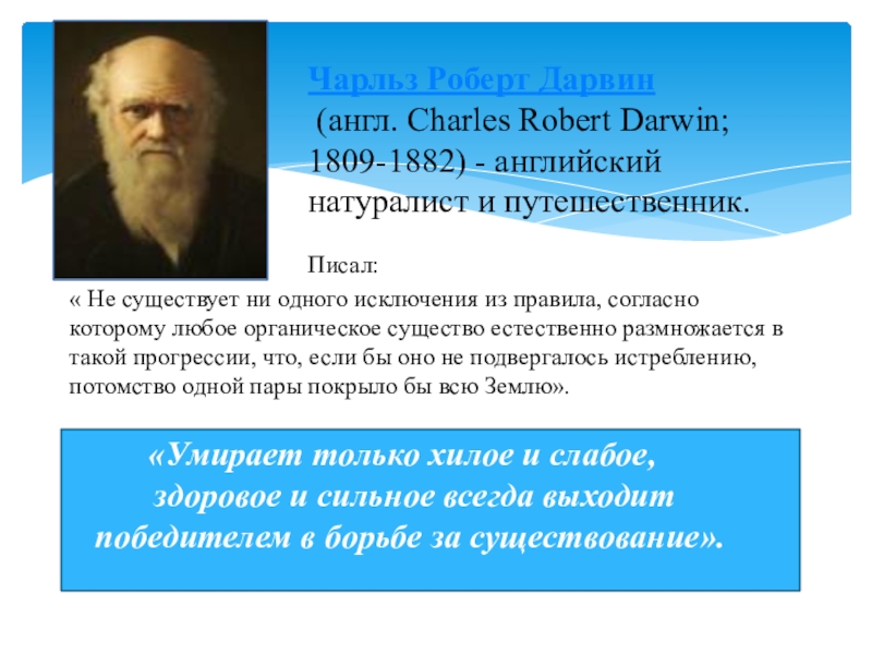 « Не существует ни одного исключения из правила, согласно которому любое органическое существо естественно размножается в такой прогрессии, что, если бы оно не подвергалось истреблению, потомство одной пары покрыло бы всю Землю».