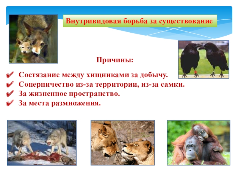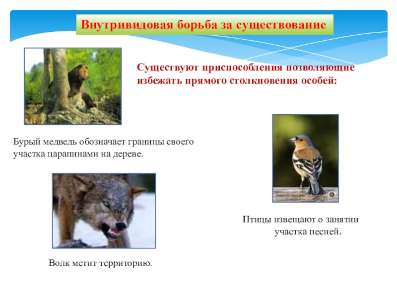Состязание между хищниками за добычу, соперничество из-за территории, из-за самки, за жизненное пространство, за места размножения.