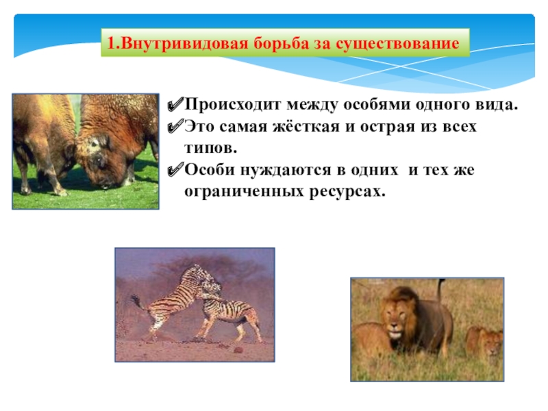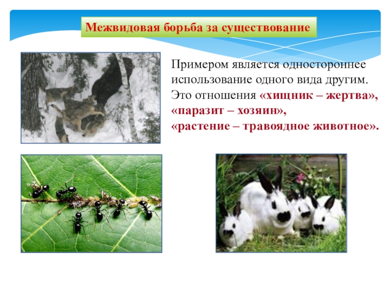 Межвидовая борьба – приводит к эволюции обоих взаимодействующих видов, к развитию у них взаимных приспособлений. Усиливает и обостряет внутривидовую борьбу.
