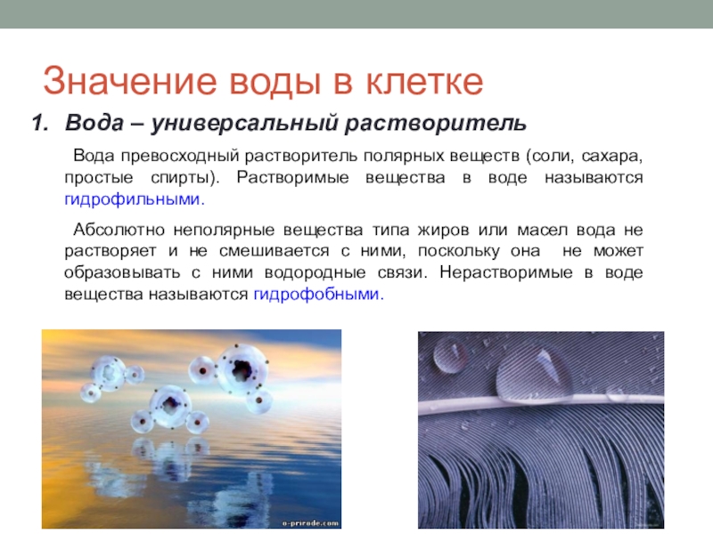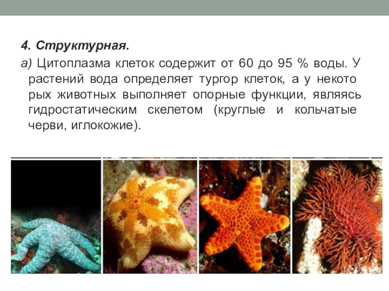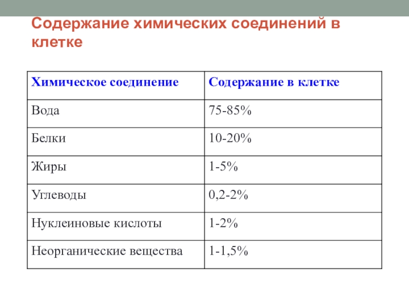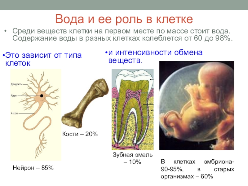 Среди веществ клетки на первом месте по массе стоит вода. Содержание воды в разных клетках колеблется от 60 до 98%.