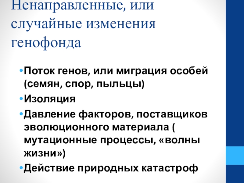 Ненаправленные, или случайные изменения генофондаПоток генов, или миграция особей (семян, спор, пыльцы)Изоляция Давление факторов, поставщиков эволюционного материала