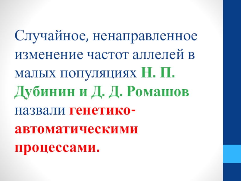 Случайное, ненаправленное изменение частот аллелей в малых популяциях Н. П. Дубинин и Д. Д. Ромашов назвали генетико-автоматическими