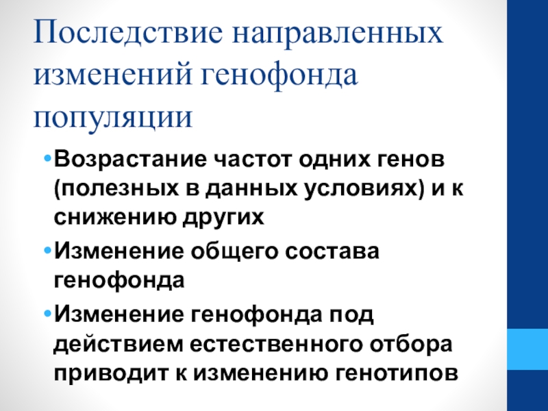 Последствие направленных изменений генофонда популяцииВозрастание частот одних генов (полезных в данных условиях) и к снижению другихИзменение общего