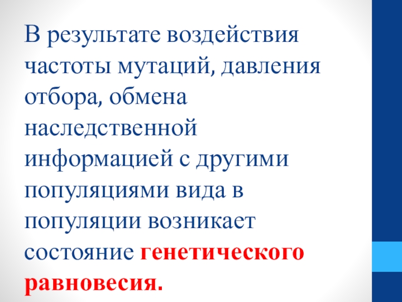 В результате воздействия частоты мутаций, давления отбора, обмена наследственной информацией с другими популяциями вида в популяции возникает состояние генетического равновесия.