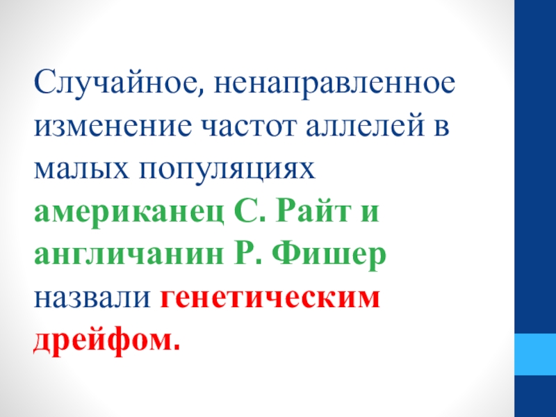 Слайд 7Случайное, ненаправленное изменение частот аллелей в малых популяциях американец С. Райт