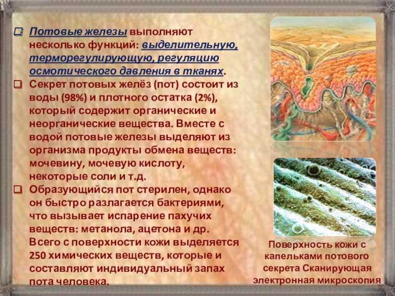 Поверхность кожи с капельками потового секрета Сканирующая электронная микроскопия