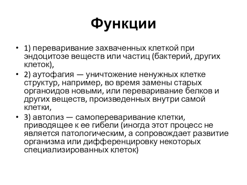 1) переваривание захваченных клеткой при эндоцитозе веществ или частиц (бактерий, других