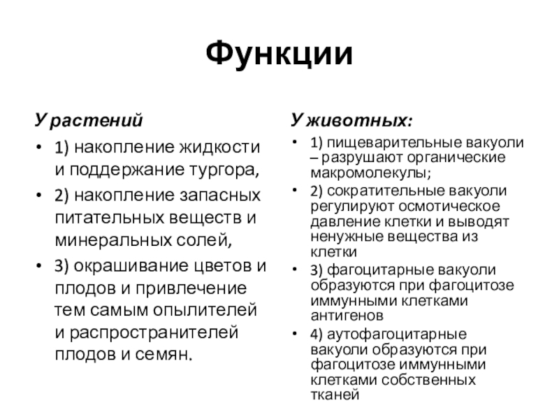 В животных клетках имеются мелкие пищеварительные и автофагические вакуоли, относящиеся к группе вторичных лизосом и содержащие гидролитические ферменты. У одноклеточных животных есть еще сократительные вакуоли, выполняющие функцию осморегуляции и выделения.