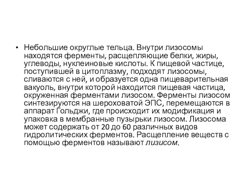 Слайд 11Небольшие округлые тельца. Внутри лизосомы находятся ферменты, расщепляющие белки, жиры, углеводы,