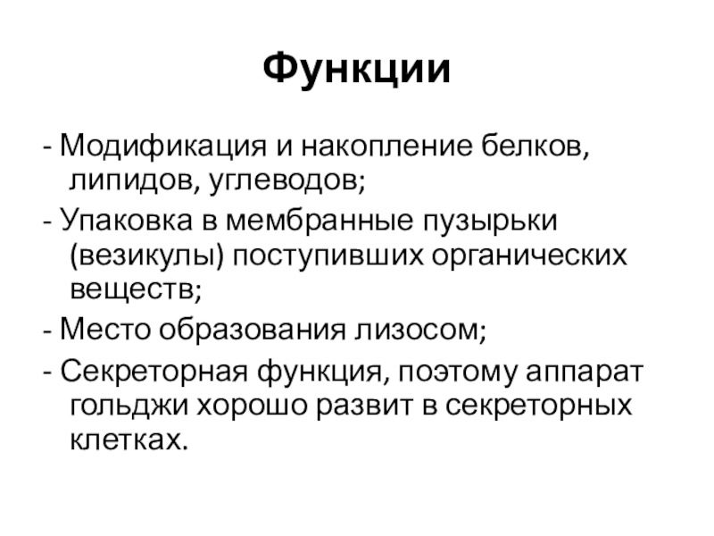 - Модификация и накопление белков, липидов, углеводов;