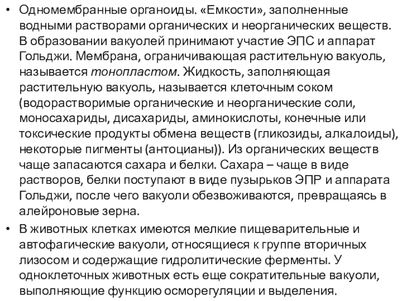 Слайд 19Одномембранные органоиды. «Емкости», заполненные водными растворами органических и неорганических веществ. В