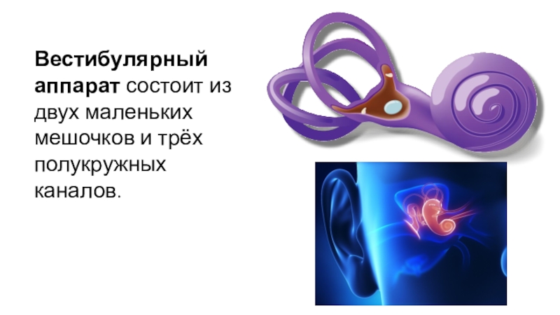 Слайд 24Вестибулярный аппарат состоит из двух маленьких мешочков и трёх полукружных каналов.
