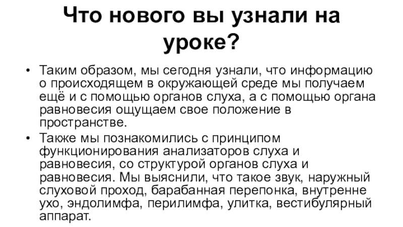 Также мы познакомились с принципом функционирования анализаторов слуха и равновесия, со структурой органов слуха и равновесия. Мы выяснили, что такое звук, наружный слуховой проход, барабанная перепонка, внутренне ухо, эндолимфа, перилимфа, улитка, вестибулярный аппарат.