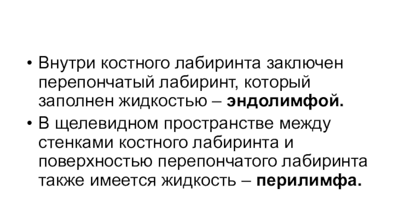 Внутри костного лабиринта заключен перепончатый лабиринт, который заполнен жидкостью – эндолимфой.