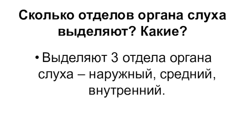 Слайд 27Сколько отделов органа слуха выделяют? Какие?