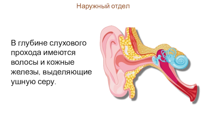 В глубине слухового прохода имеются волосы и кожные железы, выделяющие