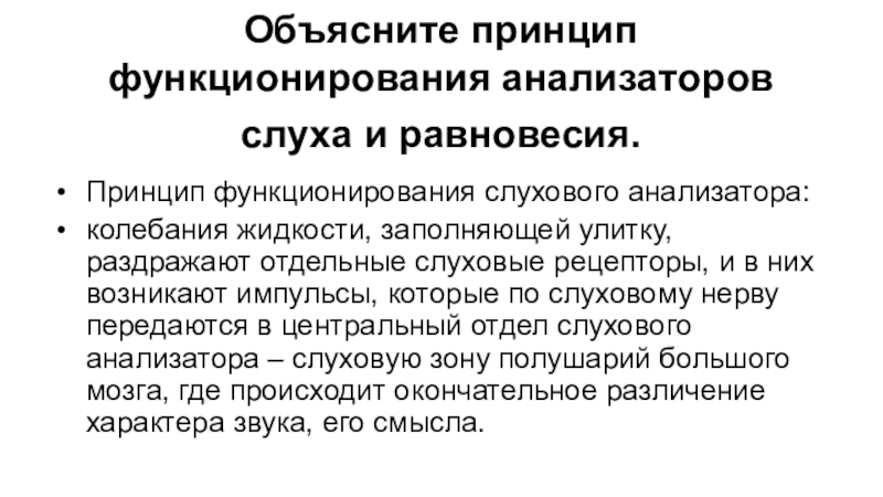 Слайд 38Объясните принцип функционирования анализаторов слуха и равновесия.