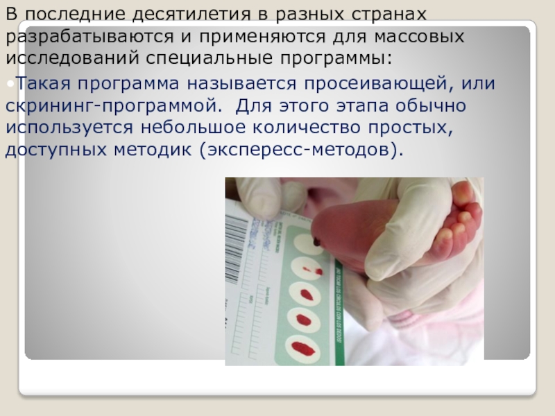 •Такая программа называется просеивающей, или скрининг-программой. Для этого этапа обычно используется небольшое количество простых, доступных методик (экспересс-методов).