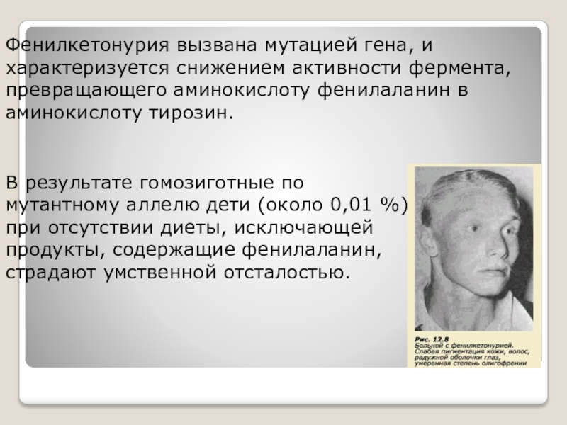 В результате гомозиготные по мутантному аллелю дети (около 0,01 %) при отсутствии диеты, исключающей продукты, содержащие фенилаланин, страдают умственной отсталостью.